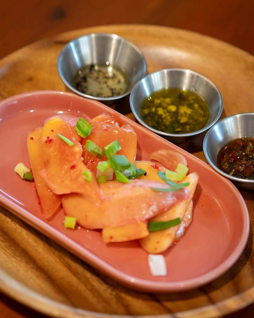 What immediately impressed me was the passion of the owners and their crystal-clear concept. The focus is on using only fresh, local, and seasonal ingredients. There’s nothing frozen, nothing imported. The talented Korean chefs behind the scenes have created a small, perfectly curated menu—something I always appreciate as a sign of quality—that evolves based on the best produce and seafood available from the local markets.